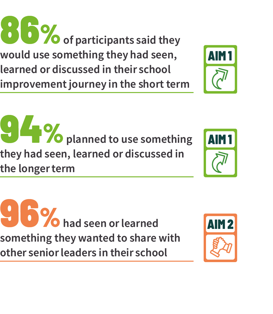 The headteacher and another senior leader (always the same one) from each school attend every visit, so trust and collaboration builds over time. The relationships formed often extend to other teachers and leaders and sustain beyond the programme lifespan, and participants have relished the chance to learn and collaborate with peers from different regions.