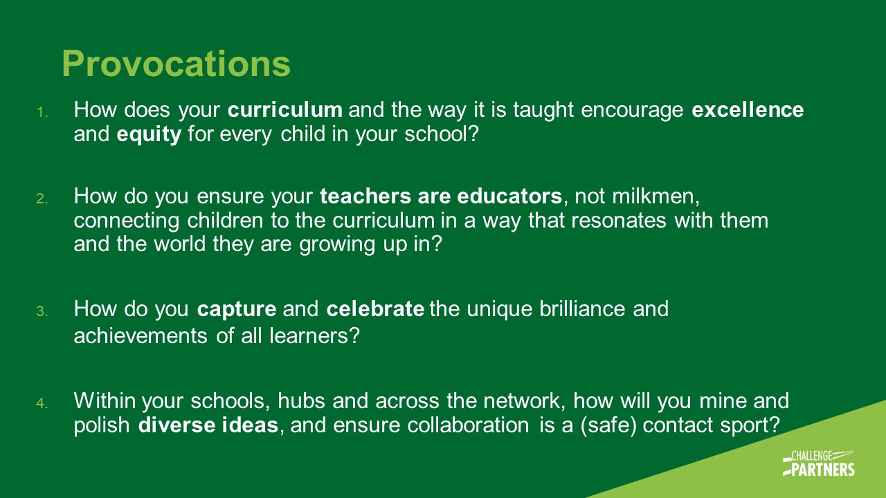 It is only one example of something we could explore to shift the paradigm to realise more inclusive excellence. To shift the paradigm, we will need to draw on and combine the diverse ideas Matthew will talk about and which we are fortunate to have in abundance in our broad and diverse network - indeed I think it is a great strength that Challenge Partners is home to such diversity of phases, school types and geography and that’s even before we get to the cognitive diversity of the unique, thoughtful, resourceful, challenging - and sometimes idiosyncratic! - leaders across our 480 schools.