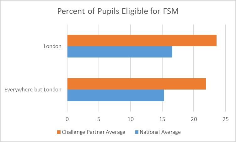 This data doesn’t capture the total number of pupils eligible, as we didn’t weight the schools based on their size. We did this because Challenge Partners works in both quite small schools and very large ones, and we wanted to make sure that a few large schools weren’t skewing the data for us.